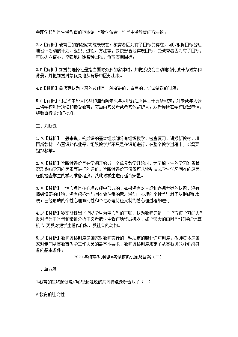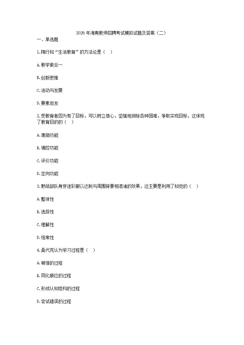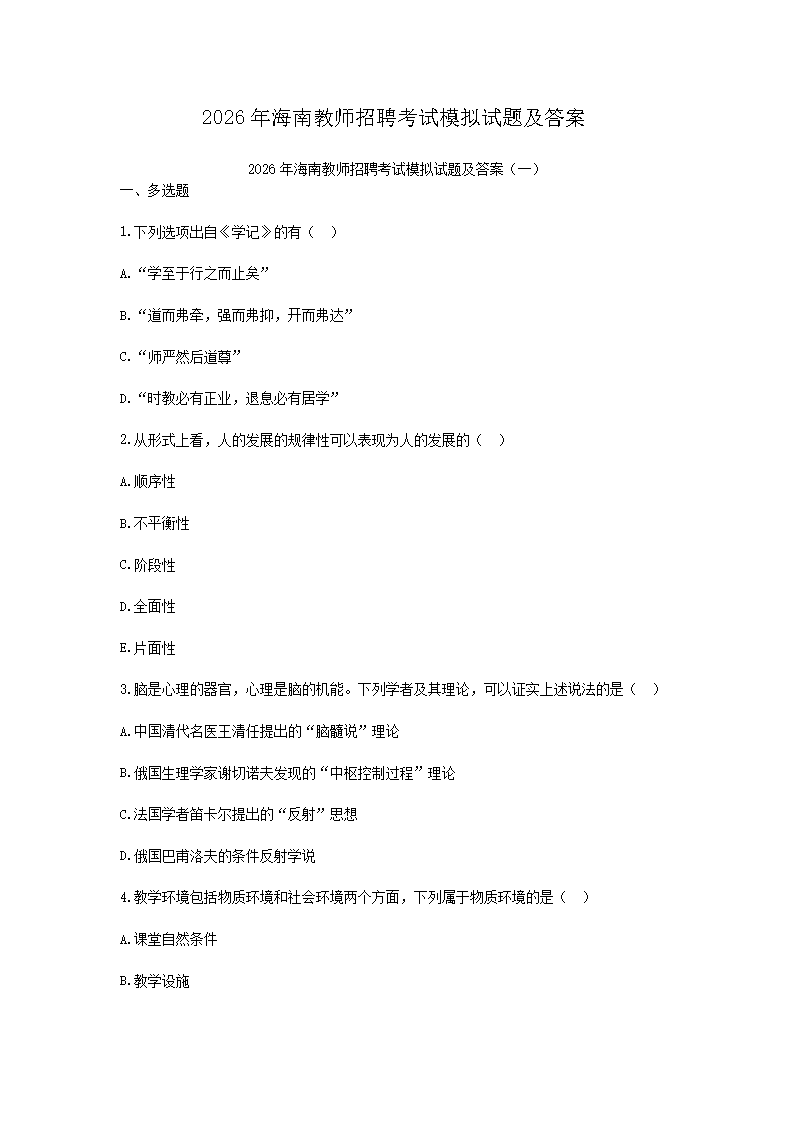 【文檔名稱】 2026年海南教師招聘考試模擬試題及答案(Word版).doc