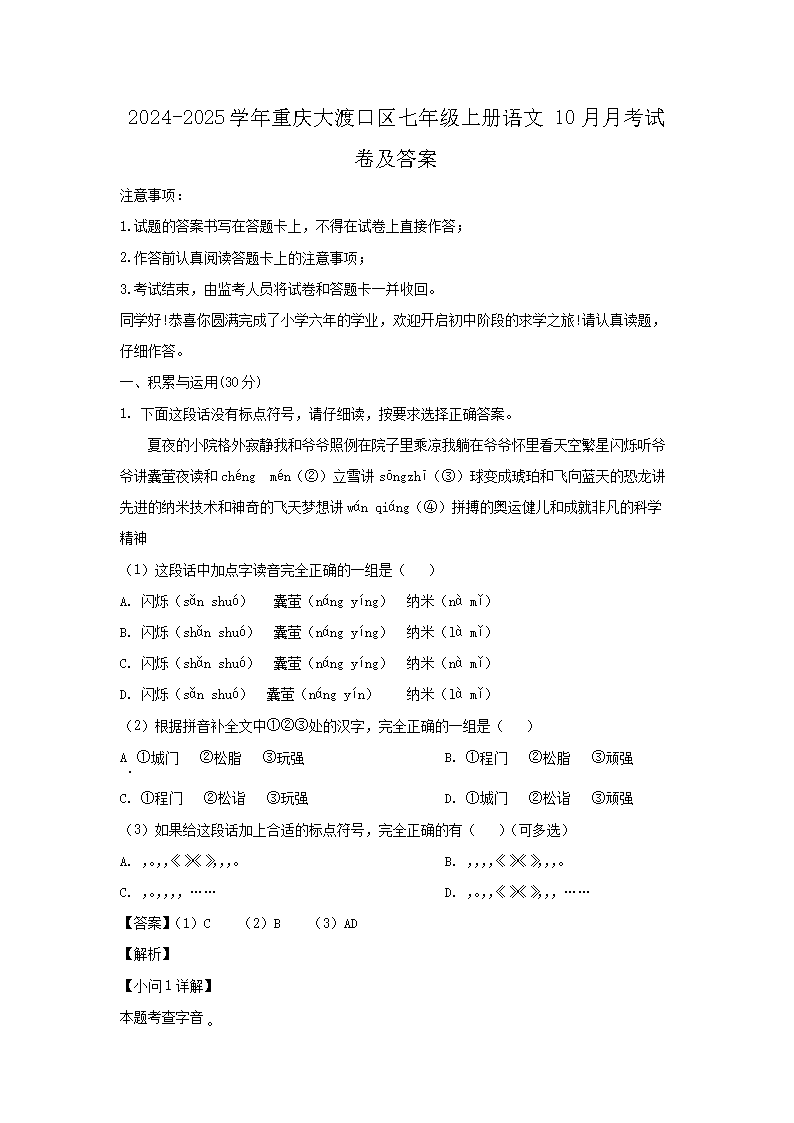 【文檔名稱】 2024-2025學(xué)年重慶大渡口區(qū)七年級上冊語文10月月考試卷及答案(Word版).doc