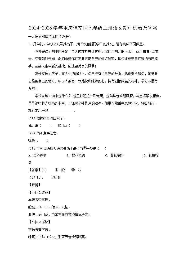 2024-2025學(xué)年重慶潼南區(qū)七年級(jí)上冊(cè)語(yǔ)文期中試卷及答案(Word版)