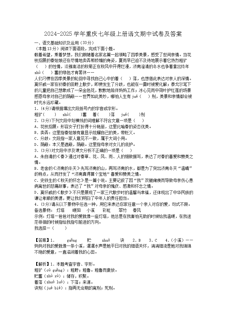 2024-2025學(xué)年重慶七年級(jí)上冊(cè)語(yǔ)文期中試卷及答案(Word版)