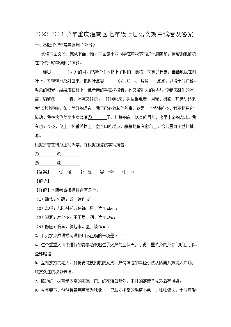 【文檔名稱】 2023-2024學年重慶潼南區(qū)七年級上冊語文期中試卷及答案(Word版).doc