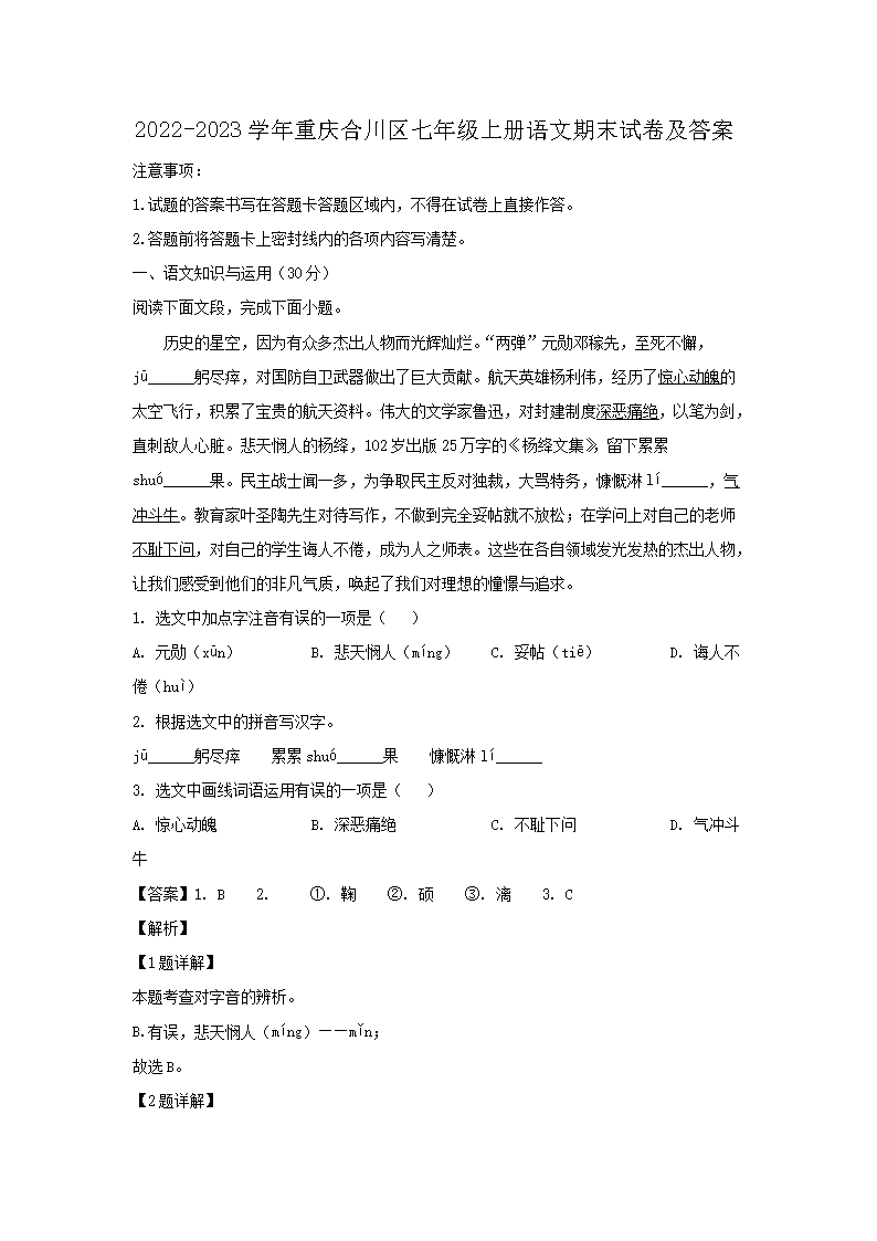 【文檔名稱】 2022-2023學(xué)年重慶合川區(qū)七年級上冊語文期末試卷及答案(Word版).doc