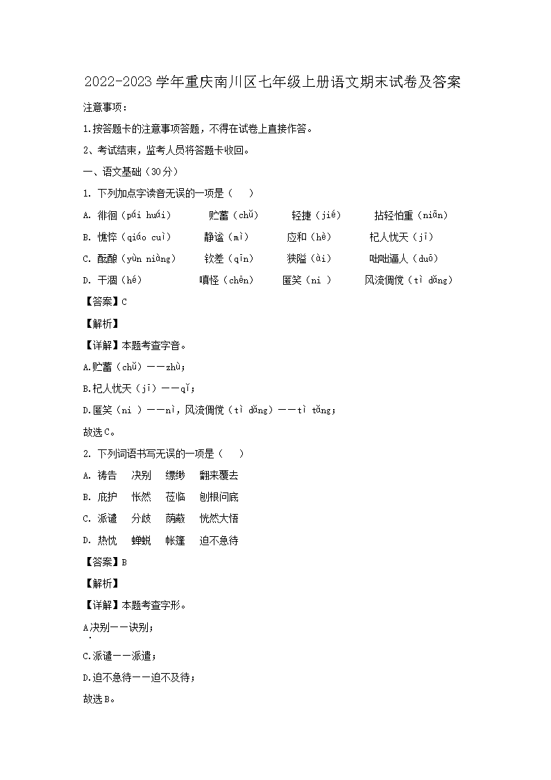 【文檔名稱】 2022-2023學年重慶南川區(qū)七年級上冊語文期末試卷及答案(Word版).doc
