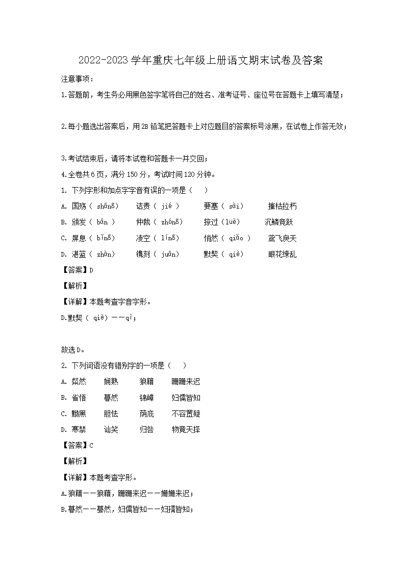 【文檔名稱】 2022-2023學年重慶七年級上冊語文期末試卷及答案(Word版).doc
