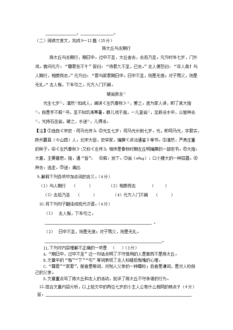 - 2022-2023學(xué)年重慶七年級(jí)上冊(cè)語(yǔ)文期末試卷及答案
