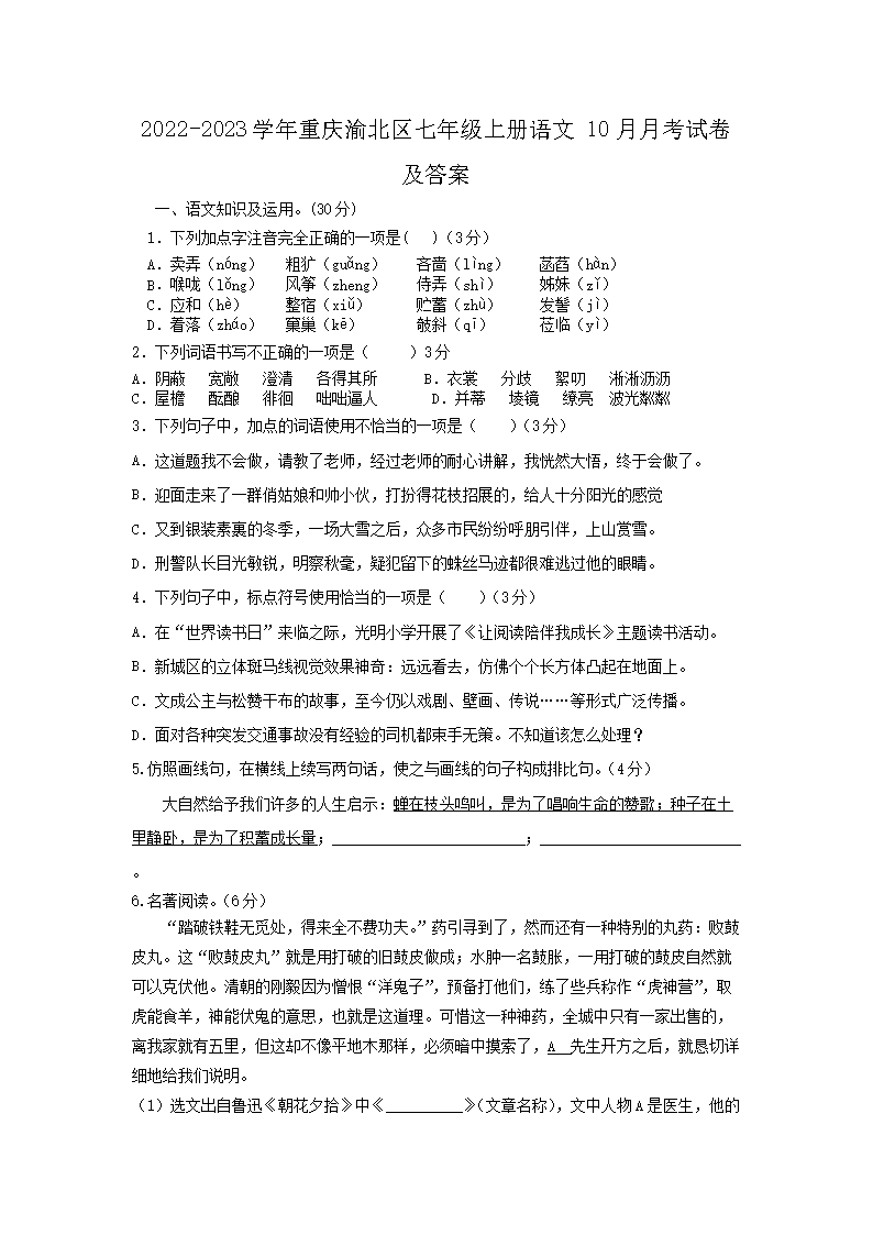 2022-2023學(xué)年重慶渝北區(qū)七年級(jí)上冊(cè)語(yǔ)文10月月考試卷及答案(Word版)