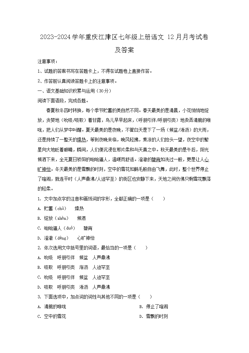 【文檔名稱】 2023-2024學(xué)年重慶江津區(qū)七年級上冊語文12月月考試卷及答案(Word版).doc