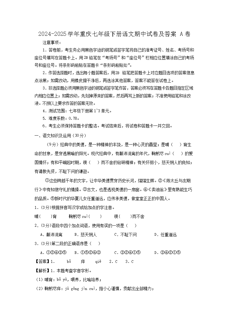 【文檔名稱】 2024-2025學(xué)年重慶七年級下冊語文期中試卷及答案A卷(Word版).doc