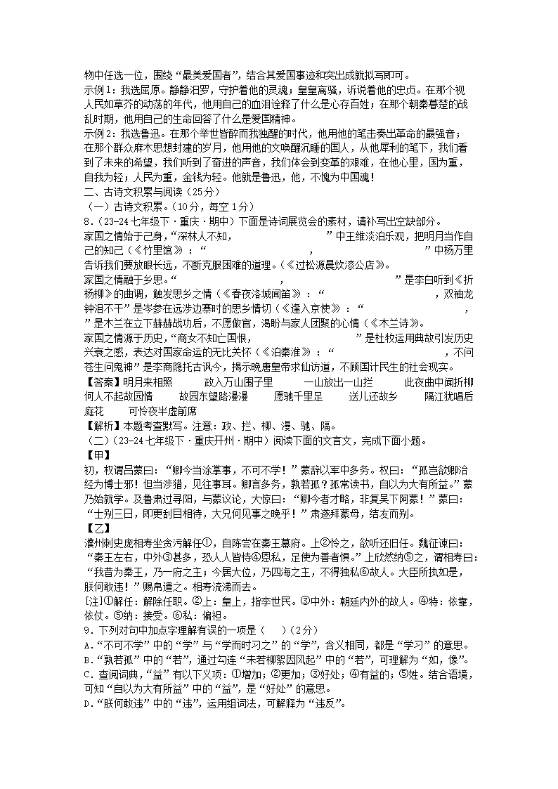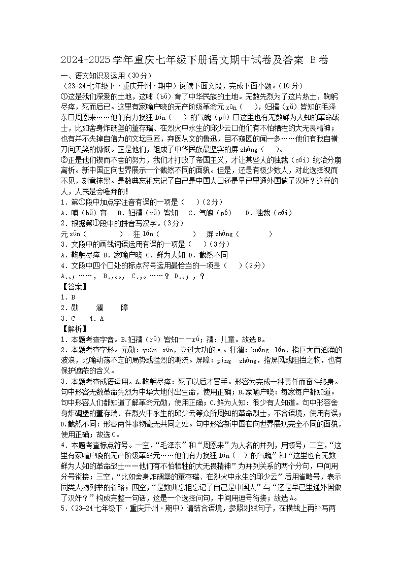 【文檔名稱】 2024-2025學(xué)年重慶七年級下冊語文期中試卷及答案B卷(Word版).doc