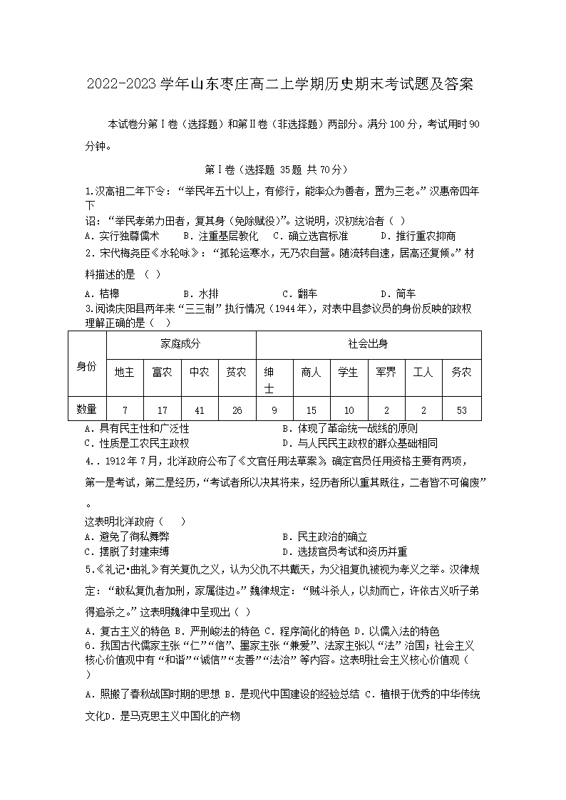 【文檔名稱】 2022-2023學年山東棗莊高二上學期歷史期末考試題及答案(Word版).doc