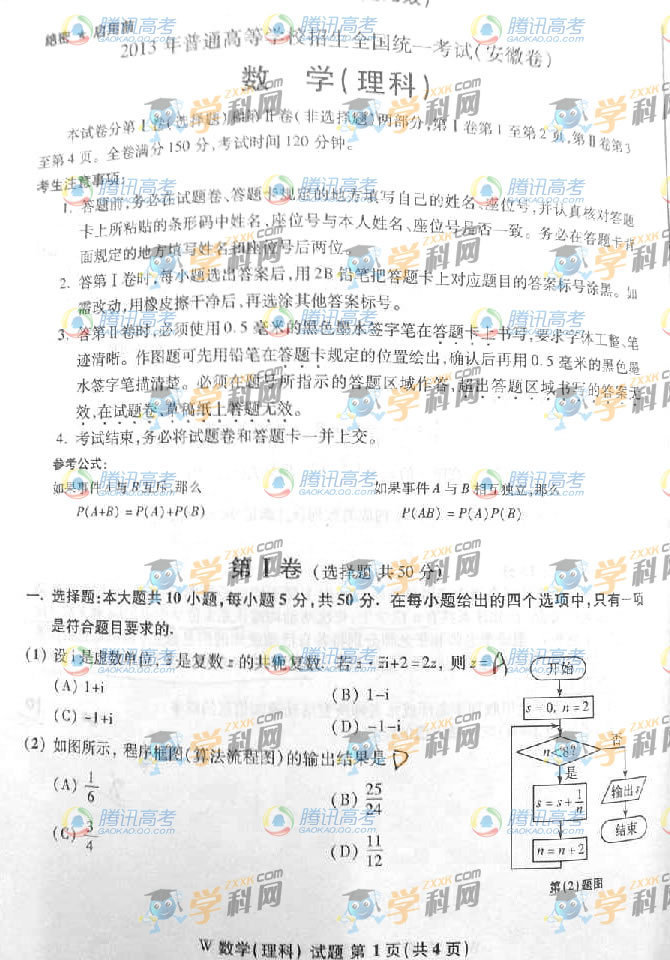 2013年安徽高考理數(shù)真題A卷(騰訊版)