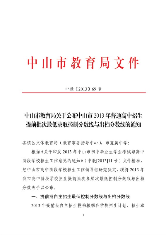2013廣東中山中考提前批次最低錄取控制分?jǐn)?shù)線與出檔分?jǐn)?shù)線