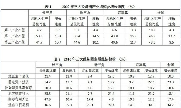 三大經(jīng)濟(jì)圈中,2010年三次產(chǎn)業(yè)增長(zhǎng)速度均超過(guò)全國(guó)平均水平的有幾個(gè)?