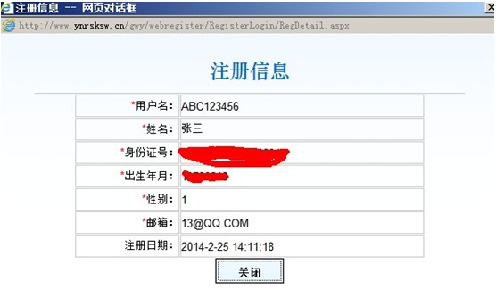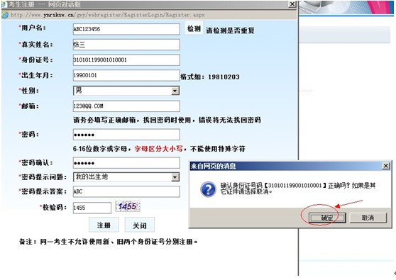 第五步:填寫注冊信息(以下為示例),檢驗身份證號是否正確,如不正解點擊“取消”重新修改,確認(rèn)正確后點擊“確定”。建議:不止校對身份證號,請校對所有填寫信息是否正確,如不正確,請點擊“取消”進(jìn)行修改,信息一旦保存便不能再修改。