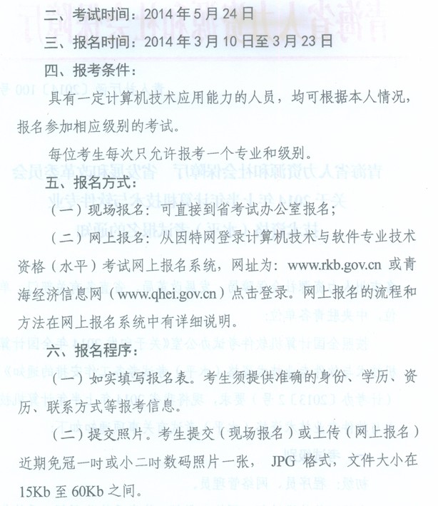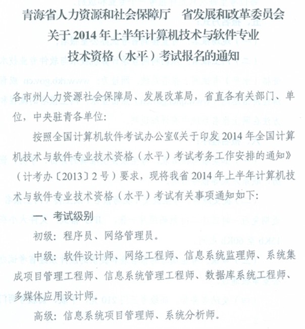 2014上半年青海計算機軟考報名通知