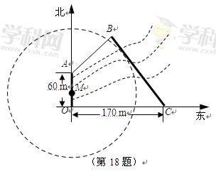 如圖,為了保護河上古橋 ,規(guī)劃建一座新橋BC,同時設(shè)立一個圓形學科網(wǎng)保護區(qū).規(guī)劃要求:新橋BC與河岸AB垂直;保護區(qū)的邊界為圓心M在線段OA上并與BC相切的圓.且古橋兩端O和A到該圓上任意一點的距離均不少于80m. 經(jīng)測量,點A位于點O正北方向60m處, 點C位于點O正東方向170m處(OC為河岸), .