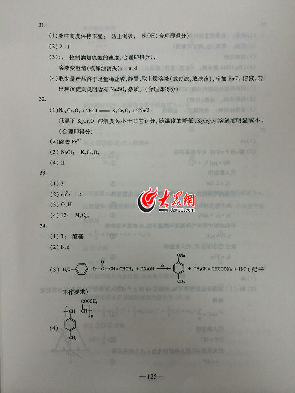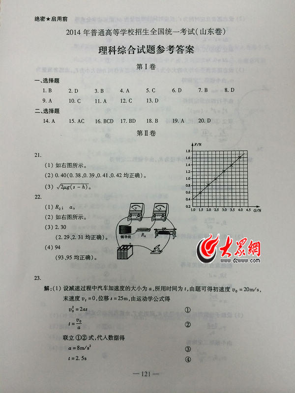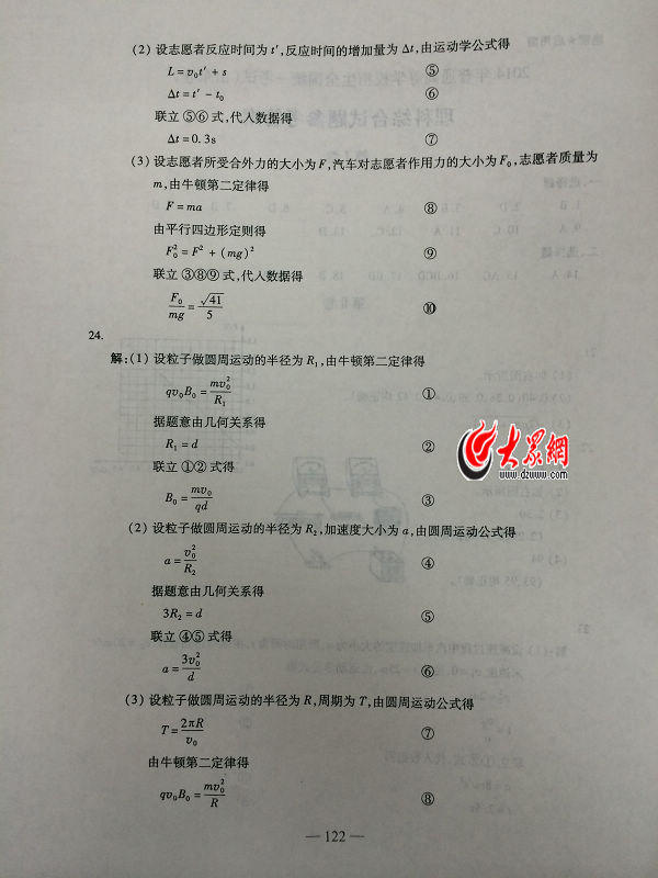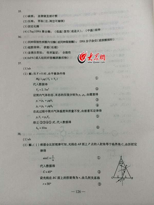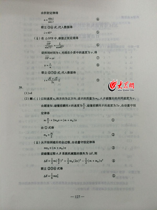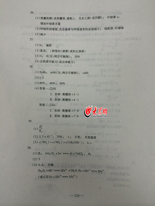 2014山東高考理綜答案(騰訊版)