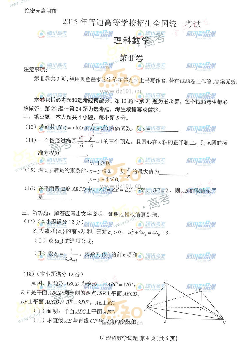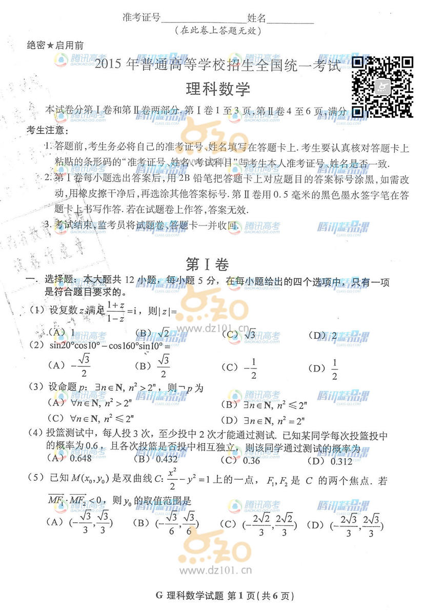 2015年河南高考數(shù)學(xué)試題:數(shù)學(xué)理(騰訊版)