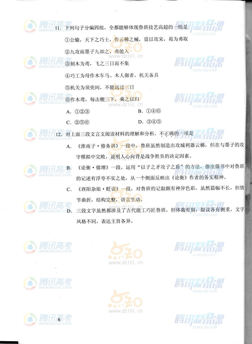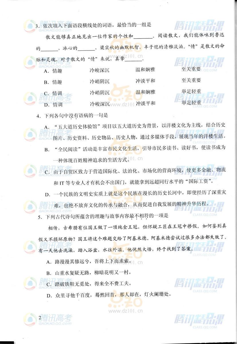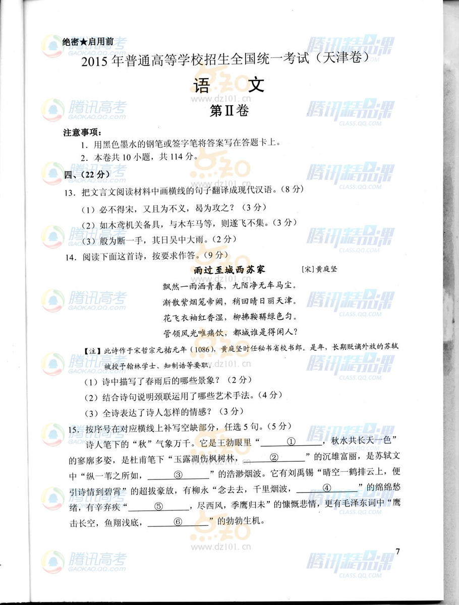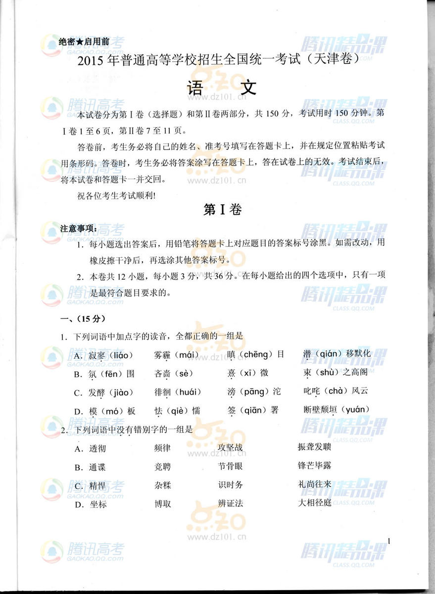 2015年天津高考語文試題(騰訊版)