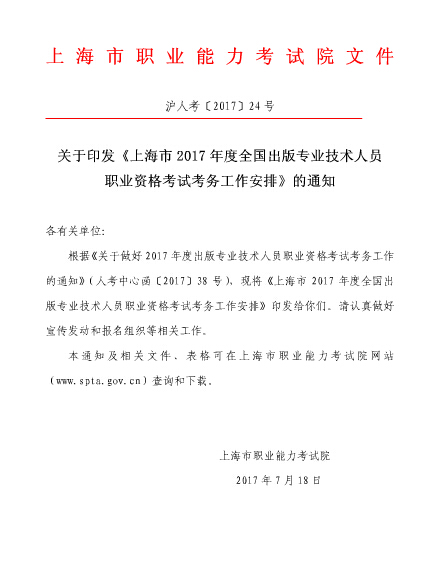 從上海市職業(yè)能力考試院獲悉,2017年上海出版專業(yè)技術人員職業(yè)資格考試考務工作安排如下: