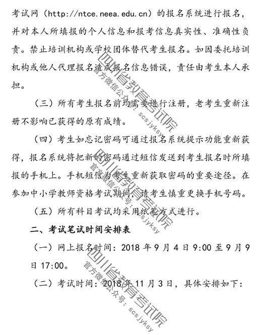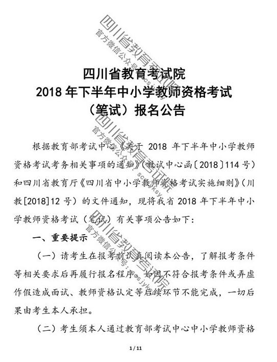 【#教師資格考試# #2018下半年四川中小學(xué)教師資格考試報(bào)名通知(筆試)#】®無憂考網(wǎng)從四川省教育考試院獲悉,2018下半年四川中小學(xué)教師資格考試報(bào)名通知(筆試)已公布,9月4日-9日進(jìn)行報(bào)名,11月3日舉行考試,具體詳情如下: