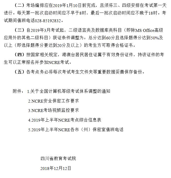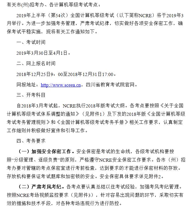 【#計算機等級考試# #2019年上半年四川全國計算機等級考試工作通知#】©無憂考網(wǎng)從四川省教育考試院獲悉,2019年3月四川計算機等級考試工作即將開始,本次等考報名時間:2018年12月25日-31日,考試時間:3月30日-4月1日,現(xiàn)將四川計算機等級考試官方公告原文發(fā)布如下:
