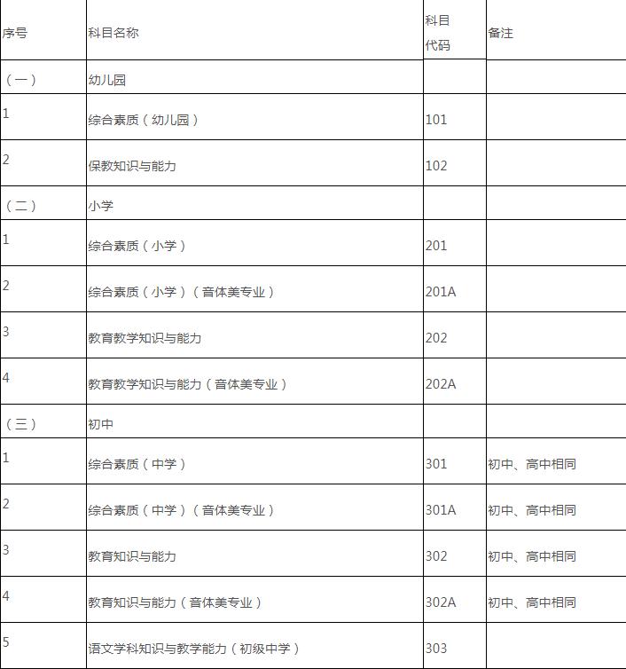 2019年上半年中小學(xué)教師資格考試(筆試)科目代碼列表
