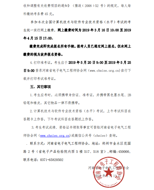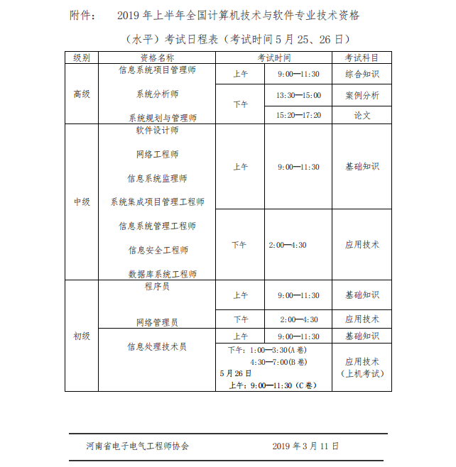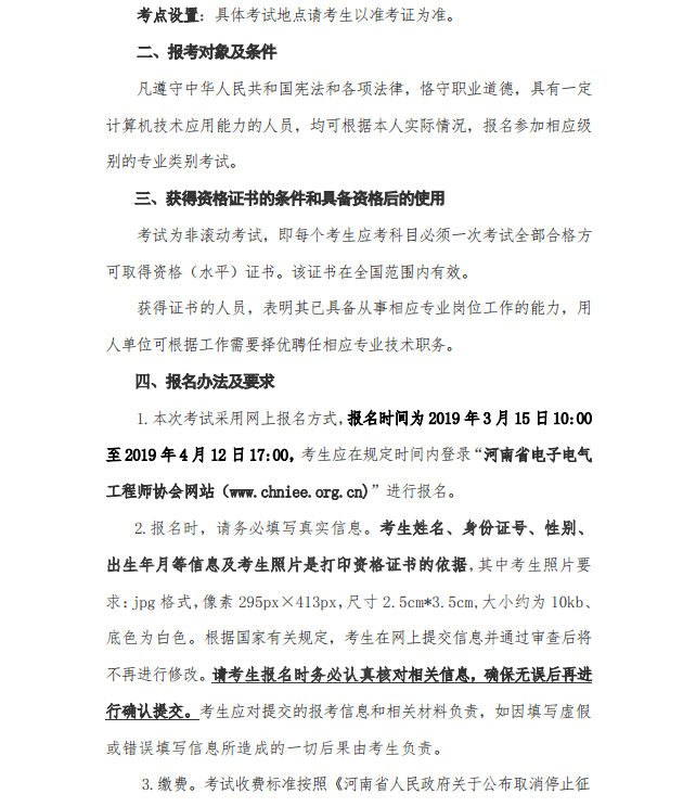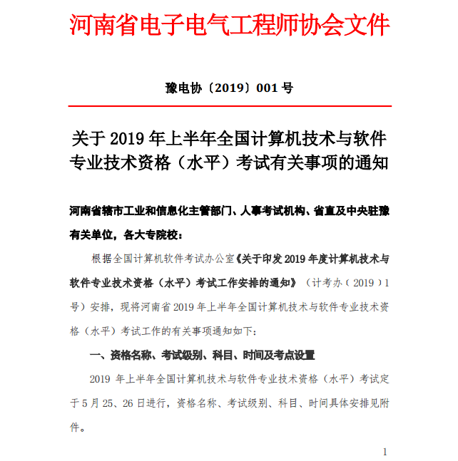 【#計算機軟件水平考試# #2019上半年河南計算機軟件水平考試報名工作通知#】2019上半年河南軟考工作現(xiàn)已開始,報名時間:3月15日-4月12日,考試時間:5月25日、26日,更多事宜請參考閱讀《考務通知》,官方公告原文如下:
