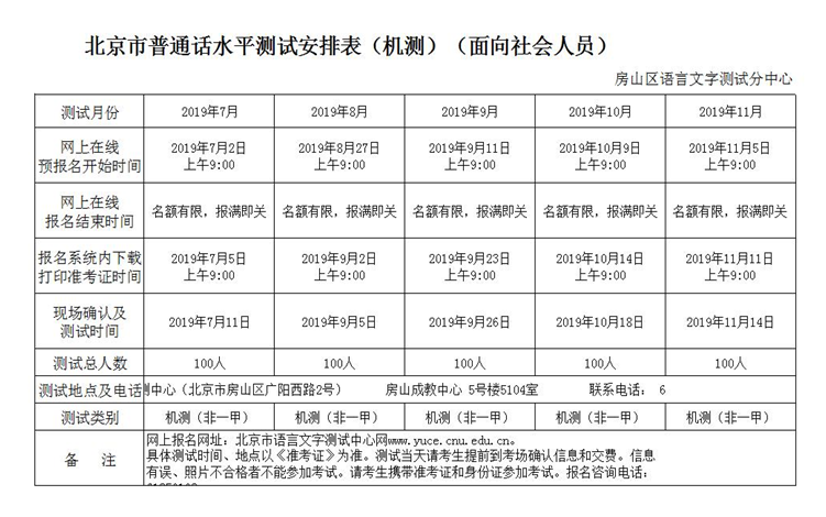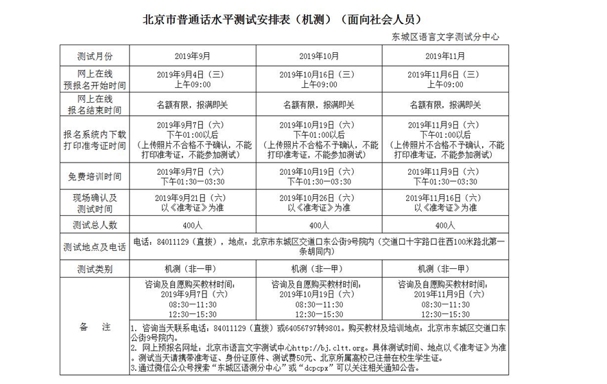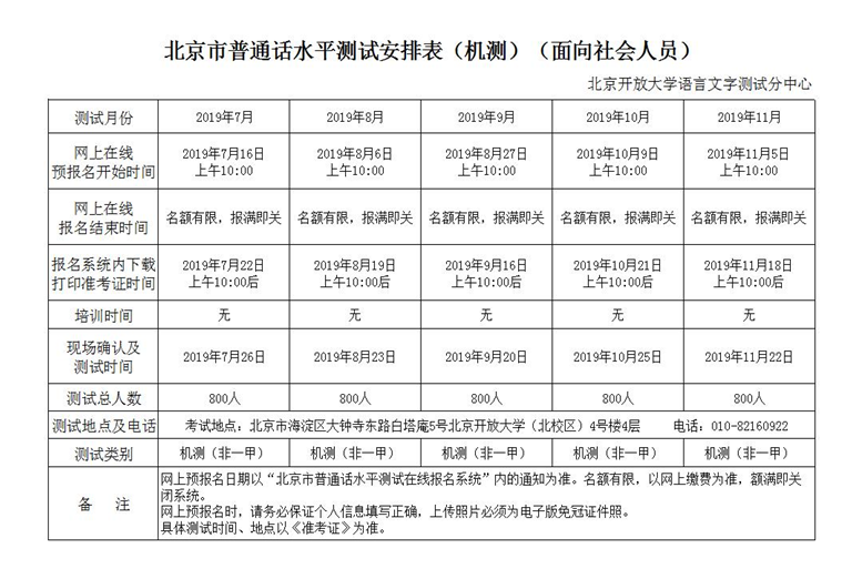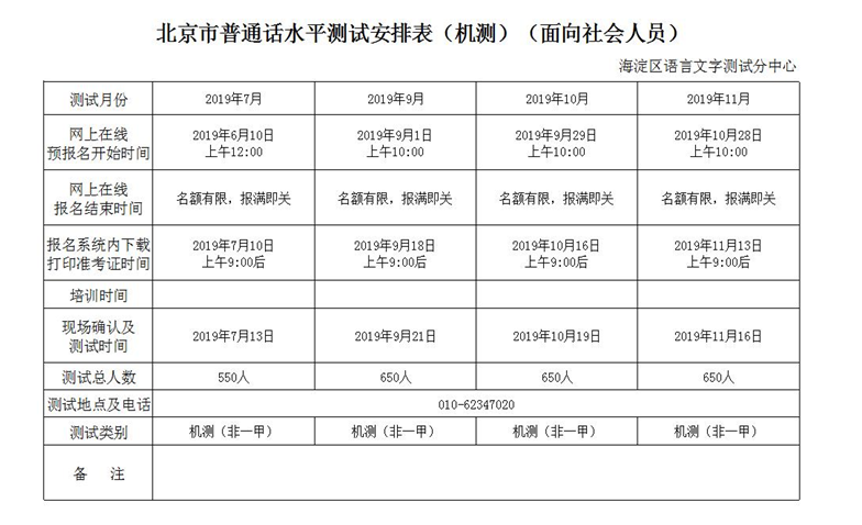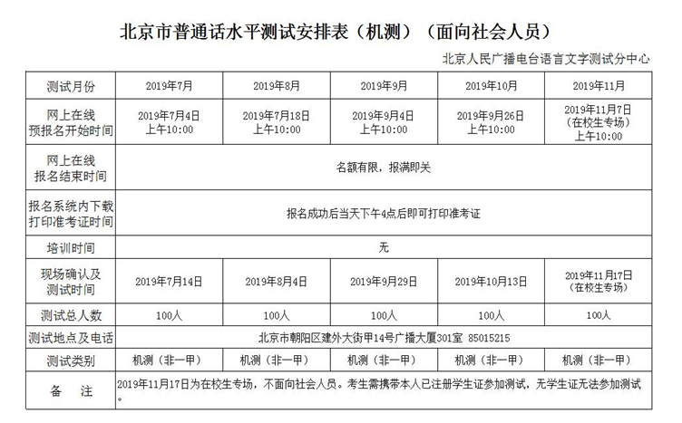 2019年7-12月北京市普通話機測測試計劃(面向社會人員)