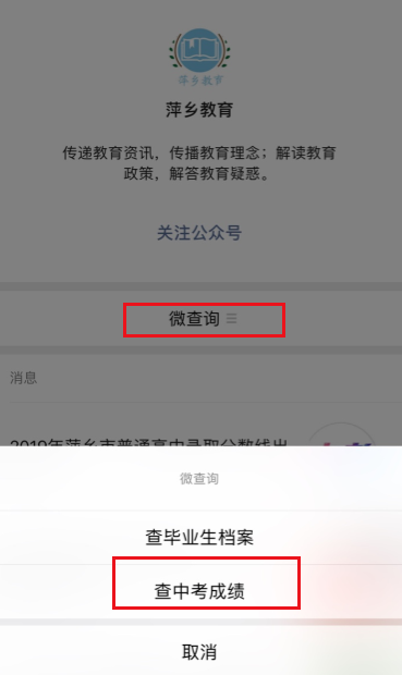 關(guān)注萍鄉(xiāng)教育微 信 公 眾 號選擇微查詢可直接查分。