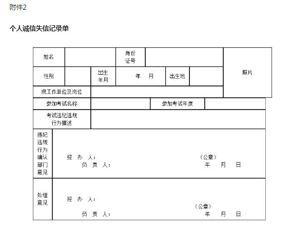建立失信應試人員黑名單制度,加大失信聯(lián)合懲戒力度,加強跨部門聯(lián)動響應。失信行為記入專業(yè)技術人員資格考試誠信檔案庫,誠信檔案庫的失信應試人員納入全國信用信息共享平臺,完善“一處失信、處處受限”的聯(lián)合懲戒機制。失信應試人員信息將視情況向社會公布或通報,并通知當事人所在單位,《個人誠信失信記錄單》(附件2)放入個人檔案,涉嫌犯罪的,移送司法機關處理。
