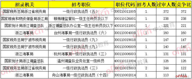 【截至18日9時】2020國考浙江地區(qū)過審人數(shù)競爭最激烈十大職位