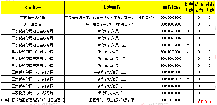 據(jù)統(tǒng)計,截至21日9時,浙江地區(qū)共有26067人報名,通過審核21018人,占報名總?cè)藬?shù)的80.63%。截至21日9時尚有23個職位無人審核通過,其中13個職位無人報考,無人報考職位占總職位數(shù)的2.41%左右。