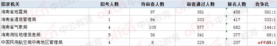 截止到21日9時(shí),競(jìng)爭(zhēng)比例的職位是海南省三亞市氣象局辦公室二級(jí)主任科員及以下一職,招錄1人,報(bào)名人數(shù)為429人,競(jìng)爭(zhēng)比高達(dá)365:1。同時(shí)報(bào)名審核通過(guò)競(jìng)爭(zhēng)比300以上的崗位還有:海南省地震局辦公室一級(jí)主任科員及以下一職以及海南省通信管理局業(yè)務(wù)處室一級(jí)主任科員及以下一職。
