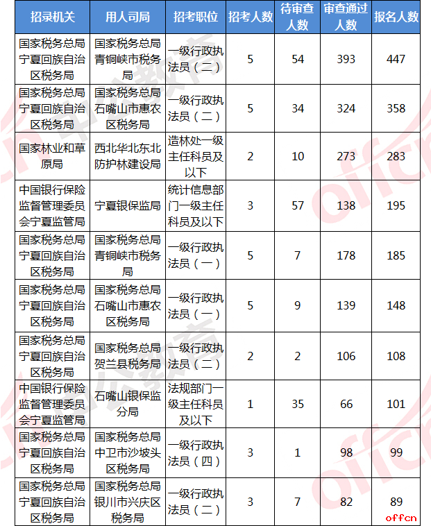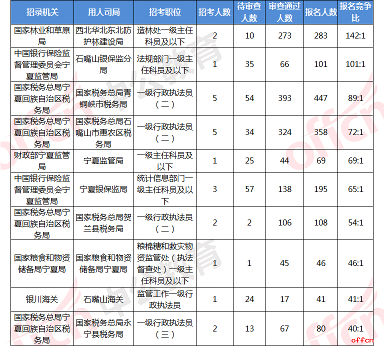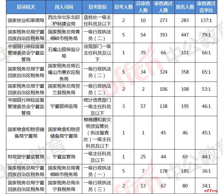 截至10月21日16時,審查通過競爭比排名前十的招錄機(jī)關(guān)主要集中在西北華北東北防護(hù)林建設(shè)局、國家稅務(wù)總局青銅峽市稅務(wù)局、石嘴山銀保監(jiān)分局,其中目前審查通過競爭比達(dá)到137:1。