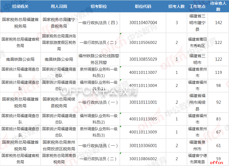截至10月23日上午9時(shí),待審查人數(shù)第一的招錄職位還是國(guó)家稅務(wù)總局建寧縣稅務(wù)局的一級(jí)行政執(zhí)法員(四)一職,而第二、第三名則分別是國(guó)家稅務(wù)總局湄洲島國(guó)家旅游度假區(qū)稅務(wù)局下一級(jí)行政執(zhí)法員(二)一職、南昌鐵路公安局下福州鐵路公安處線路警務(wù)區(qū)民警一職?傮w來(lái)看國(guó)家稅務(wù)總局建寧縣稅務(wù)局的熱度一直很高,始終排在前三。由于國(guó)考報(bào)名審核人數(shù)是實(shí)時(shí)更新,所以建議考生及時(shí)關(guān)注的審核動(dòng)態(tài)。還沒(méi)通過(guò)審核的考生也不要心急,請(qǐng)耐心等待更新,畢竟報(bào)名人數(shù)太多,審核資料需要一定的時(shí)間。今天已經(jīng)是2020國(guó)考報(bào)名的第八天了,還未報(bào)名的考生們,一定要把握時(shí)間,切勿太晚報(bào)名。為幫助廣大考生了解報(bào)名情況,©無(wú)憂考網(wǎng)整理了待審查人數(shù)前十位的部門(mén),供廣大考生參考。