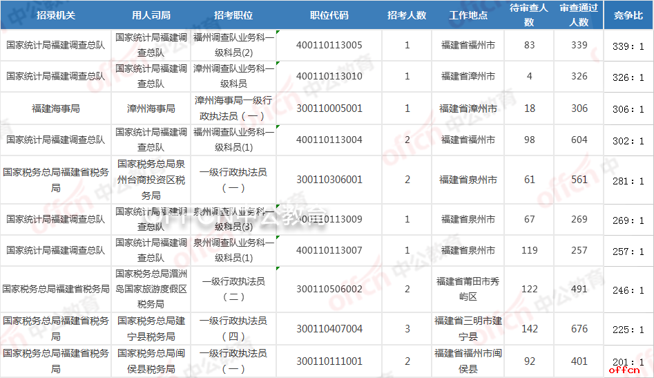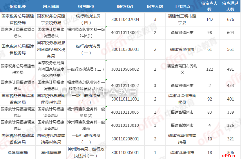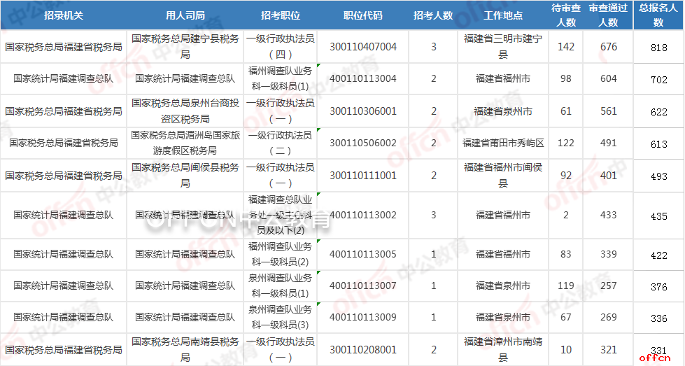 截至10月23日上午9時(shí),國(guó)考審核通過(guò)人數(shù)排名第一的崗位易主,為國(guó)家稅務(wù)總局建寧縣稅務(wù)局下的一級(jí)行政執(zhí)法員(四)職位,而昨日統(tǒng)計(jì)數(shù)據(jù)時(shí),第一的職位國(guó)家統(tǒng)計(jì)局福建調(diào)查總隊(duì)的福州調(diào)查隊(duì)業(yè)務(wù)科一級(jí)科員(1)一職,已退居第二名,可見(jiàn)競(jìng)爭(zhēng)激烈的。還未報(bào)名的考生需要注意了,報(bào)考也是決定是否能成功上岸的一個(gè)重要因素,所以對(duì)競(jìng)爭(zhēng)如此激烈的崗位,考生們也是要慎重選擇的哦~以下是©無(wú)憂考網(wǎng)整理的審查通過(guò)人數(shù)排名前十的崗位信息:
