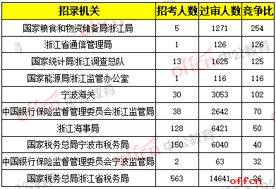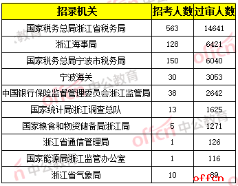 從上表可以看出,國家稅務總局浙江省稅務局以14641人過審的數(shù)量,占據(jù)數(shù)量榜第一名,該部門的競爭比為26:1,位列競爭榜第十名。另外,國家糧食和物資儲備局浙江局招錄5人,現(xiàn)過審人數(shù)1271人,競爭比254:1。