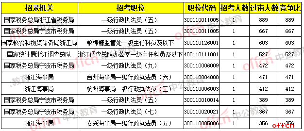 截止到10月23日9時,國家稅務總局浙江省稅務局的“一級行政執(zhí)法員(五)”這一職位招錄1人,目前已有889人過審,成為目前競爭最激烈的職位。寧波海關的“海關監(jiān)管一級行政執(zhí)法員(一)”過審人數(shù)最多,以1341人過審的數(shù)量占據(jù)過審人數(shù)榜首位。