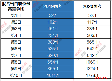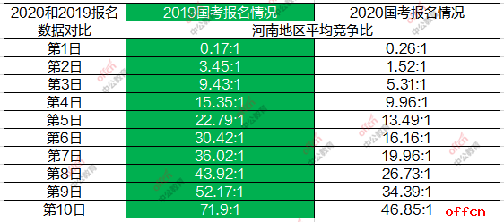 對(duì)比19國(guó)考報(bào)名期間每日競(jìng)爭(zhēng)比的職位來(lái)看,20國(guó)考河南地區(qū)每日?qǐng)?bào)名職位競(jìng)爭(zhēng)比,遠(yuǎn)超去年。