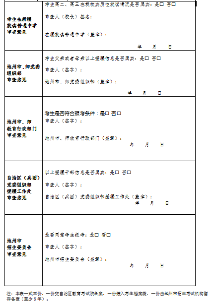 。6)區(qū)外地級以上(含地級)組織派遣或受聘在新疆工作三年以上(含三年)的專業(yè)技術(shù)人員、公務(wù)員在援疆工作期間,其子女普通高中階段在疆連續(xù)實質(zhì)性就讀兩年(高二、高三)并且有在疆就讀兩年的學(xué)籍檔案,子女本人是新疆常住戶籍人口,允許在疆報考(須由組織部門出具父(母)援疆派遣手續(xù)等相關(guān)證明材料)。非兵團(tuán)系統(tǒng),可由考生戶籍所在地地級(含地級)以上黨委組織部門出具證明材料,經(jīng)考生戶籍所在地(州、市)招生委員會批準(zhǔn),同時報自治區(qū)教育考試院備案后準(zhǔn)予報名;兵團(tuán)系統(tǒng),可由新疆生產(chǎn)建設(shè)兵團(tuán)師級(含師級)以上黨委組織部門出具證明材料,經(jīng)考生就學(xué)所在地(州、市)招生委員會批準(zhǔn),同時報自治區(qū)教育考試院備案后準(zhǔn)予報名。