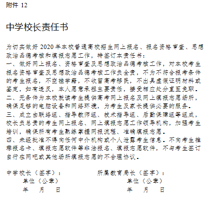 5.各級招生考試機(jī)構(gòu)和高級中等教育學(xué)校要加強(qiáng)考生的誠信教育和警示教育?忌谏暾垐竺麜r,須簽訂誠信書,本人所填寫內(nèi)容、提供的相關(guān)證明材料客觀、真實、準(zhǔn)確,參加招生考試時遵守有關(guān)管理規(guī)定。