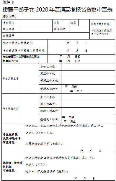 8.援疆干部子女2020年普通高考報名資格審查登記表