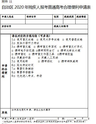 11.自治區(qū)2020年殘疾人報考普通高考合理便利申請表