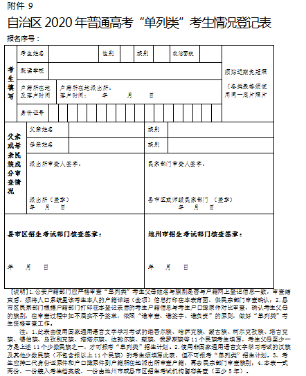 9.自治區(qū)2020年普通高考“單列類”考生情況登記表