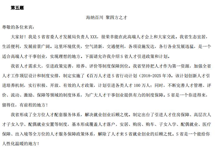 問題五:假設(shè)你是S省省委人才發(fā)展局的工作人員,請根據(jù)“給定資料5”,以“海納百川聚四方之才”為題,為S省省委人才發(fā)展局有關(guān)負(fù)責(zé)人撰寫宣講會(huì)上的推介講話稿。(30分)