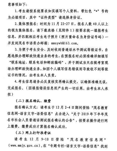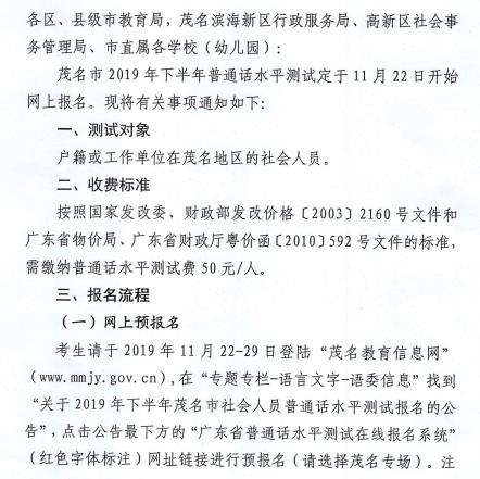 【#普通話考試# #2019下半年廣東茂名社會(huì)人員普通話測(cè)試預(yù)報(bào)名通知#】©無(wú)憂考網(wǎng)從茂名市人民政府獲悉,2019下半年廣東茂名社會(huì)人員普通話測(cè)試預(yù)報(bào)名通知已公布,報(bào)名時(shí)間為11月22日-29日,考試時(shí)間為12月11日,具體詳情如下: