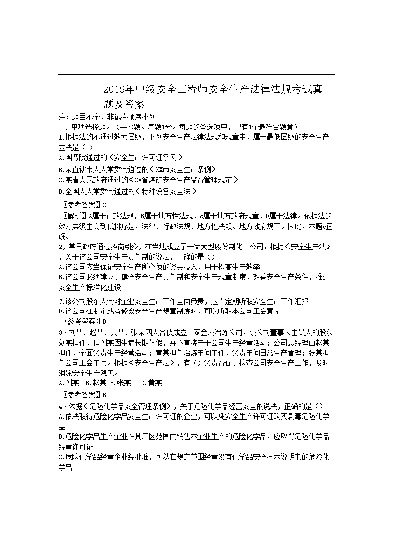 2019年中級(jí)安全工程師安全生產(chǎn)法律法規(guī)考試真題及答案(Word版)