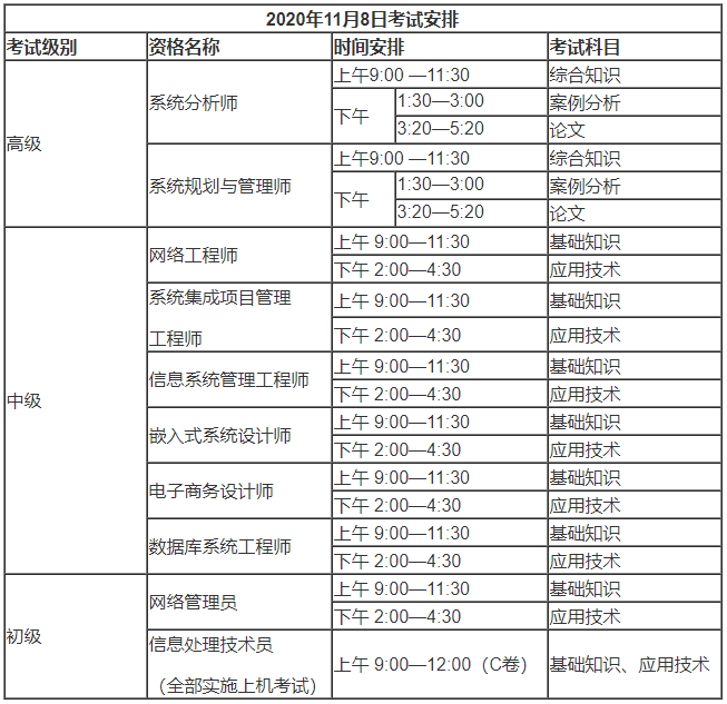 2020年全國計算機技術(shù)與軟件專業(yè)技術(shù)資格(水平)考試時間安排(附表一)
