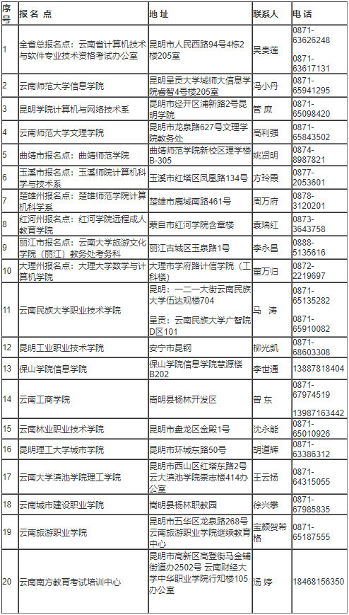 云南省全國計算機技術(shù)與軟件專業(yè)技術(shù)資格(水平)考試各地報名點(附表三)